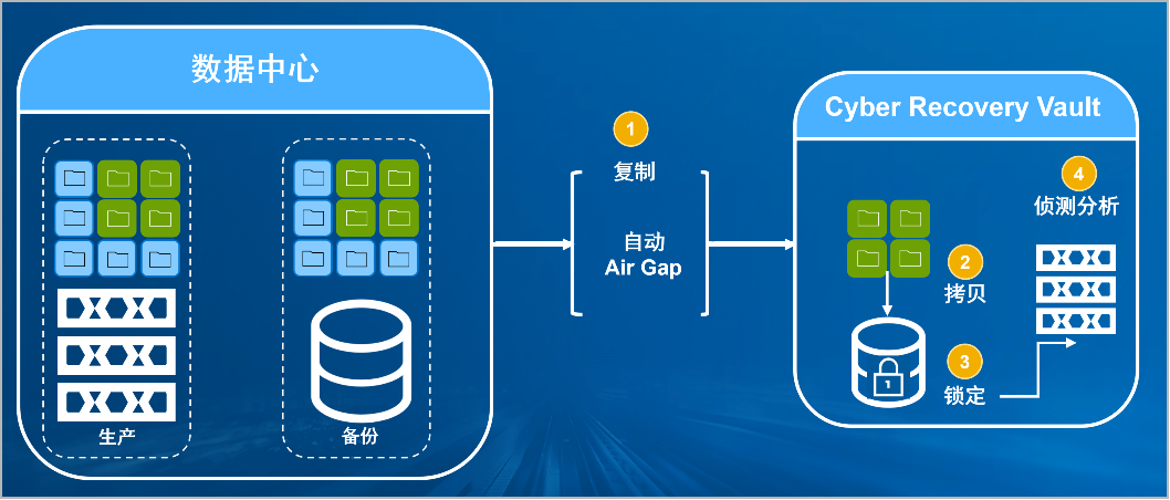 顺发配资防勒索病毒方案将生产中心备份数据复制到Vault区,复制后网络自动断开实现弹性隔离。Vault区的数据快速拷贝,并对拷贝版本加锁(在锁定期数据不允许删除和修改)。Vault沙箱内对拷贝版本进行扫描分析,验证数据是否完好。